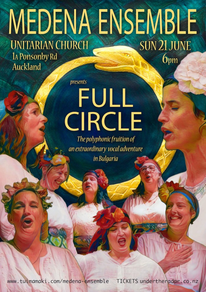 Welcome to the doorstep of many interlocking, cross-pollinating projects involving voice and devotion… the next place to gather will be around Aotearoa winter solstice, in the beautiful wooden harbour of The Auckland Unitarian Church. There Medena Ensemble – impassioned local vocalists freshly returned from Bulgaria – will share their blend, led in harmony and delightful dissonance, par moi.